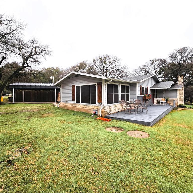 This lovely 3 bedroom, 2 bath home is located just a short walk from Lake Whitney. The spacious living area features a fireplace and you will find multiple living spaces. The updated kitchen with breakfast area features new stainless steel appliances, travertine tile backsplash and beautiful granite countertops. As you walk into the spacious master suite you will find an attached office perfect for working from home and an updated master bath. Recent updates include a new roof and new HVAC system. In the rear of the home you will find a spacious, private backyard shaded by mature trees with a fire pit perfect for entertaining. This home also features an outdoor shower convenient for those relaxing days spent at the lake. There are two separate storage buildings located on the property, to include a workshop and smaller utility room, both with electricity.