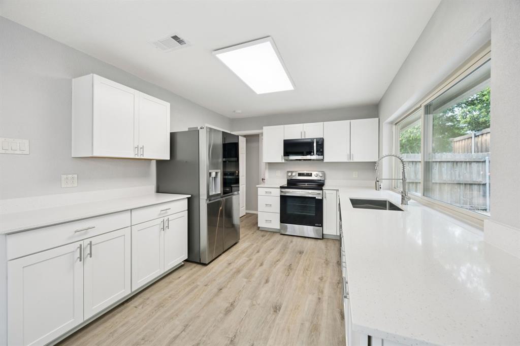 Fully remodeled Richardson 3-bedroom, 2-bathroom offering a perfect blend of modern comfort and everyday functionality without sacrificing character. Step inside and feel the difference. Vaulted ceilings with exposed beams stretch overhead, making the open-concept living area feel even more expansive and inviting. A wall of windows floods the space with natural light, while the eye-catching black stone tile fireplace adds contemporary character to the space. It’s the kind of living room that feels just as right for a quiet evening after a long day as it does for a lively weekend gathering with those closest to you. An adjoining dining area flows seamlessly into a completely reimagined kitchen, where clean lines and thoughtful design take center stage. Crisp white shaker cabinets, sleek quartz countertops, all brand new stainless steel appliances, and updated fixtures offer both style and substance. Easy-to-maintain luxury vinyl plank flooring runs throughout the home, providing flooring that’s as stylish as it is durable. Both bathrooms have been tastefully updated with clean finishes and modern touches, helping to maintain a cohesive style throughout the home. This isn’t a lazy remodel thrown together by investors just churning through their next flip. The owner didn’t limit their upgrades to just cosmetics. This carefully remodeled home comes with a new roof, updated HVAC system, updated windows, and a new water heater, offering peace of mind, long-term value, and energy efficiency to keep utility bills down and monitored alarm system. All cast iron plumbing was recently replaced, a crucial update in this neighborhood! Step outside and you’ll find additional storage in the backyard shed. Enjoy the convenient location near local parks and walking trails.