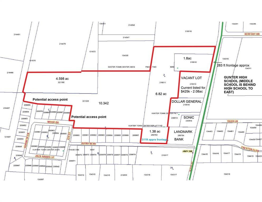 You cannot find better located land in Gunter, a city on the growth path. Very reasonably priced considering location, and size. Frontage on Preston Rd and Autry Blvd. Entry point may be made from 4th St and Robineta Ln also. Multiple plats - develop one at a time or or all together. Residential and commercial possibilities....You won't find a better land in Gunter once this is gone. NOTE: BUYER IS RESPONSIBLE FOR CONFIRMING ALL DETAILS RELATED TO ZONING, ROAD EXTENSIONS, USAGE, UTILITIES, EASEMENTS, ETC. The seller has a survey that will be provided to the buyer. If the lender or title company requires a new survey, the buyer pays for new survey. See attachment for plat details, parcel ids, etc.
