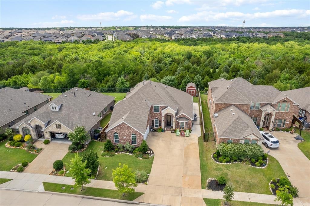 GREENBELT VIEWS & NO REAR NEIGHBORS! This beautifully maintained First Texas home backs to a serene greenbelt and is just a short walk to parks and trails and Lake Lavon. The versatile layout includes a private Office with French doors, first-floor Media Room, and light-filled Living Room with soaring ceilings and in-wall speakers. The chef’s Kitchen boasts granite countertops, a large island, dual ovens, dry bar with mini fridge, and huge walk-in pantry. Retreat to the Primary Suite with bay windows, crown molding, and spa-like bath featuring dual granite vanities, frameless shower, and soaking tub. Upstairs offers generously sized Bedrooms—two with Jack-and-Jill Bath—and a spacious Game Room. Enjoy the outdoors with a large covered patio, extra concrete for seating or grilling, lush backyard, and 10x12 shed. Extras include exterior security cameras, Ring doorbell, tankless water heater, custom drapery, and ceiling storage in the oversized 2-car garage. Located in Inspiration—an award-winning community with multiple pools, lazy river, 2-story fitness center, dog parks, pickleball, sand volleyball, zip line, and year-round events. Premium upgrades, resort-style amenities, unbeatable location—this one has it all!
