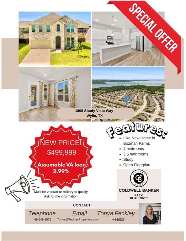 * Incredible Value* Now Offered at $499,000! **Assumable VA** BRING AN OFFER!! Refrigerator, Washer & Dryer all convey with an acceptable offer! WOW! Gorgeous Like-New Home in Bozman Farms! See private remarks for rate information. Upgrades include: 220 plug in garage, storage racks, curtains and curtain rods that are present stay. Custom selected - a few from Pottery Barn! Welcome home to this beautifully maintained, move-in-ready home in the highly sought-after Bozman Farms community of Wylie! This spacious residence features an open-concept floorplan, perfect for modern living and entertaining. The main floor offers a bright and airy living space that seamlessly connects the kitchen, dining, and family areas. The kitchen is a chefs dream with ample cabinetry, a large island, and gas range. Natural light floods the space in the dining and living room! Enjoy the convenience of having the primary suite and a dedicated home office or secondary bedroom downstairs, ideal for work-from-home needs or quiet retreats. Upstairs, you'll find three additional bedrooms, one with an en-suite bath and a versatile loft or game room. Multiple storage closets throughout making this home your perfect find! Come enjoy the fantastic amenities Bozman Farms offers including parks, walking trails, catch and release ponds, and pools. Located just minutes from top-rated Wylie ISD schools, shopping, dining and entertainment! Don't miss the opportunity to own this stunning home that feels brand new!