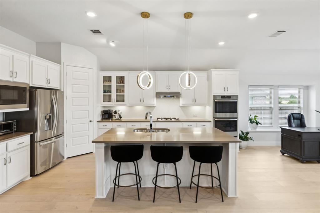 Immaculate and Move-In Ready...Shows like a model home! This stunning NORTH facing one-story home in sought-after Creekside Estates is better than new, showcasing over $40K in upgrades including brand new wood flooring throughout in 2024 (no carpet in this house!), new interior paint in 2024, updated light fixtures, sink fixtures and more. NEW ROOF just installed in June 2025! Hard to find ONE STORY home with 3 car garage makes this unique and highly sought after! Designed with a modern-contemporary flair, this home features 4 spacious bedrooms, 3 full bathrooms, large formal dining room and a 3-car garage—perfectly suited for both functionality and style. The thoughtfully designed layout includes a private guest suite with an adjacent full bath, two additional bedrooms tucked away in a separate hallway with a shared bath, and a luxurious primary suite boasting a spa-inspired bath with a garden tub, separate shower, and a generous walk-in closet.The beautifully appointed kitchen is a chef’s dream with quartz countertops, an oversized island, GE stainless steel appliances, double-oven, walk-in pantry, and 42” cabinets—some with glass accent fronts for that designer touch. Corner fireplace with designer tile enhances the cool relaxed vibe of the large family room with plenty of room for entertaining. Enjoy casual meals in the sunny breakfast nook with views of the patio and yard. Additional highlights include a mudroom off the garage to keep things organized and tidy, a large laundry room with space for a freezer, and an expansive covered back patio with gas hookup, ideal for outdoor entertaining. The large private backyard offers plenty of space for play, relaxation or future enhancements. All of this is nestled in the highly acclaimed Wylie ISD, in a peaceful and established neighborhood. Take a walk along Creekside Park Trail and enjoy the community pool and catch and release lake! Homes like this don’t come around often—schedule to see this exceptional home today!