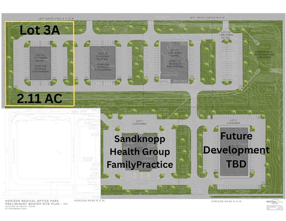 Prime location! (3) Three building sites (pad ready) located in the Heath's Horizon Business & Medical area already zoned commercial with all utilities on site. Located at Horizon & FM 549 (Buffalo Way) one of the main thoroughfares between Heath & Rockwall & just 2 miles from the Texas Health Hospital which offers a close and convenient proxomity to most other medical services & specialties. Nearby is Baylor Medical Plaza & these three sites are directly ajacent to the nearly complete 18,000SF Dr. Sandknop's Family Medical Practice, A Cardiology Group & a medical labratory as well. Zoning allows for office and retail as well. The availability of land that is aleady zoned and ready to go in the Rockwall & Heath area is virtually non existant. Survey's available.