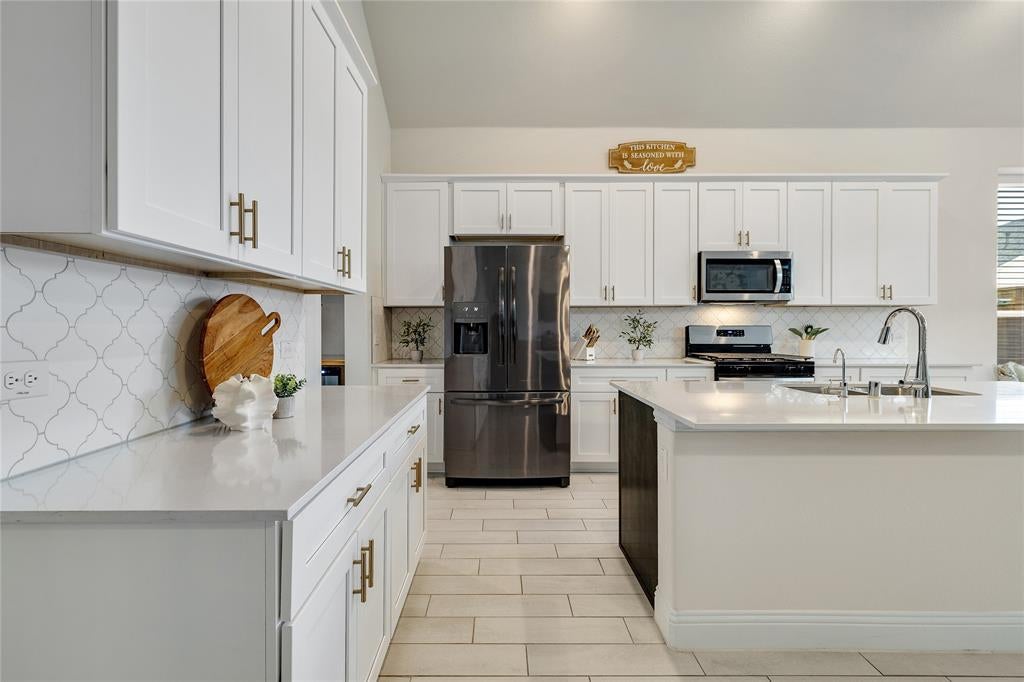 $10,000 BUYER INCENTIVE! OVERSIZED LOT, TWO BEDROOMS DOWN, MCKINNEY ISD! Take advantage of a generous $10,000 buyer incentive with an acceptable offer on this like-new 2022-built home in Celina’s coveted Venetian at Weston, a master-planned community set to offer future resort-style amenities including a lagoon, waterpark, and year-round activities. Situated on an oversized lot with an extended driveway and striking white brick exterior, this meticulously maintained home blends modern sophistication with functional design. The open-concept layout, enhanced by extensive builder upgrades, creates a seamless flow between the kitchen, dining, and living areas, all bathed in natural light. A gas fireplace anchors the main living space, framed by a wall of windows that invite the outdoors in. Perfect for multigenerational living or hosting guests, the main level features the luxurious primary suite and a secondary bedroom with full bath. The chef-inspired kitchen boasts a sprawling quartz island, stainless steel appliances including a gas range, sleek cabinetry, and a walk-in pantry. A stylish butler’s pantry with custom natural oak countertop and open shelving connects effortlessly to the formal dining room. The primary suite is a serene retreat with bay windows, dual quartz vanities, an upgraded walk-in shower, soaking tub, and a spacious walk-in closet. Upstairs, three additional bedrooms, two full baths, a large game room, and a media room wired for surround sound provide ample space for family and entertaining. Step outside to the expansive backyard with covered patio and lush green space, ideal for relaxation or gatherings. Additional upgrades include upgraded laundry, quartz counters in all baths, wood-look tile flooring, newly replaced fence, French drains, and a 220V garage outlet perfect for EV charging or workshop use. This home combines modern luxury, thoughtful design, and functional living in one of Celina’s most desirable communities.