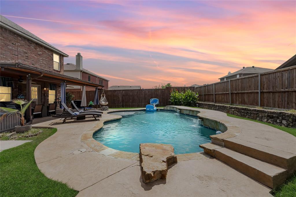 Gorgeous East-Facing Two-Story with Sparkling Pool! This stunning home showcases a light and bright open concept layout with tasteful upgrades throughout. Featuring 4 bedrooms plus a dedicated study! Beautiful hardwood floors flow through the main living areas, leading into the chef’s kitchen with two-tone cabinetry, quartz countertops, stainless steel appliances, and a walk-in pantry. The kitchen opens seamlessly to the spacious living room, anchored by a cozy fireplace, perfect for gatherings and everyday living.The private primary retreat is conveniently located on the first floor and boasts a spa-like bath with dual vanities, a soaking tub, glass-enclosed shower, and walk-in closet. Upstairs, you’ll find a spacious flex space along with secondary bedrooms for family or guests. Step outside to your backyard oasis, complete with an extended covered patio, pergola, sparkling pool with lounging benches and dive rocks, and a privacy fence! The large backyard provides plenty of room for pets or play, an ideal setting for Texas summers and year-round entertaining! Neighborhood amenities include a community pool, splash park, playground, and scenic walking trails. All this, just minutes from highway access, local restaurants, and shopping.